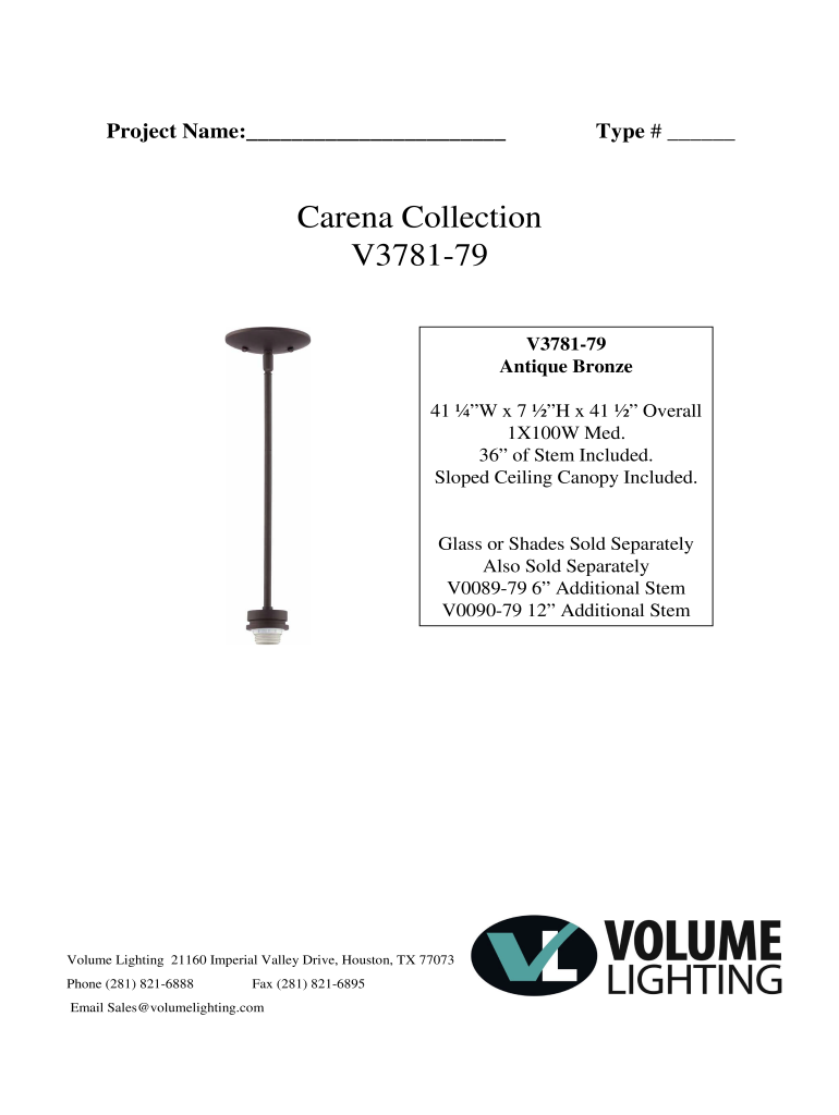 Project Name: Type # Carney Collection V378179 Antique Bronze 41 W × 7 H × 41 Overall 1×100W Med. 36 of Stem Included. Sloped Ceiling Canopy Included. Glass or Shades Sold Separately Also Sold