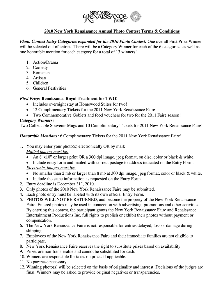 2010 New York Renaissance Annual Photo Contest Terms & Conditions Photo Contest Entry Categories expanded for the 2010 Photo Contest: One overall First Prize Winner will be selected out of entries.