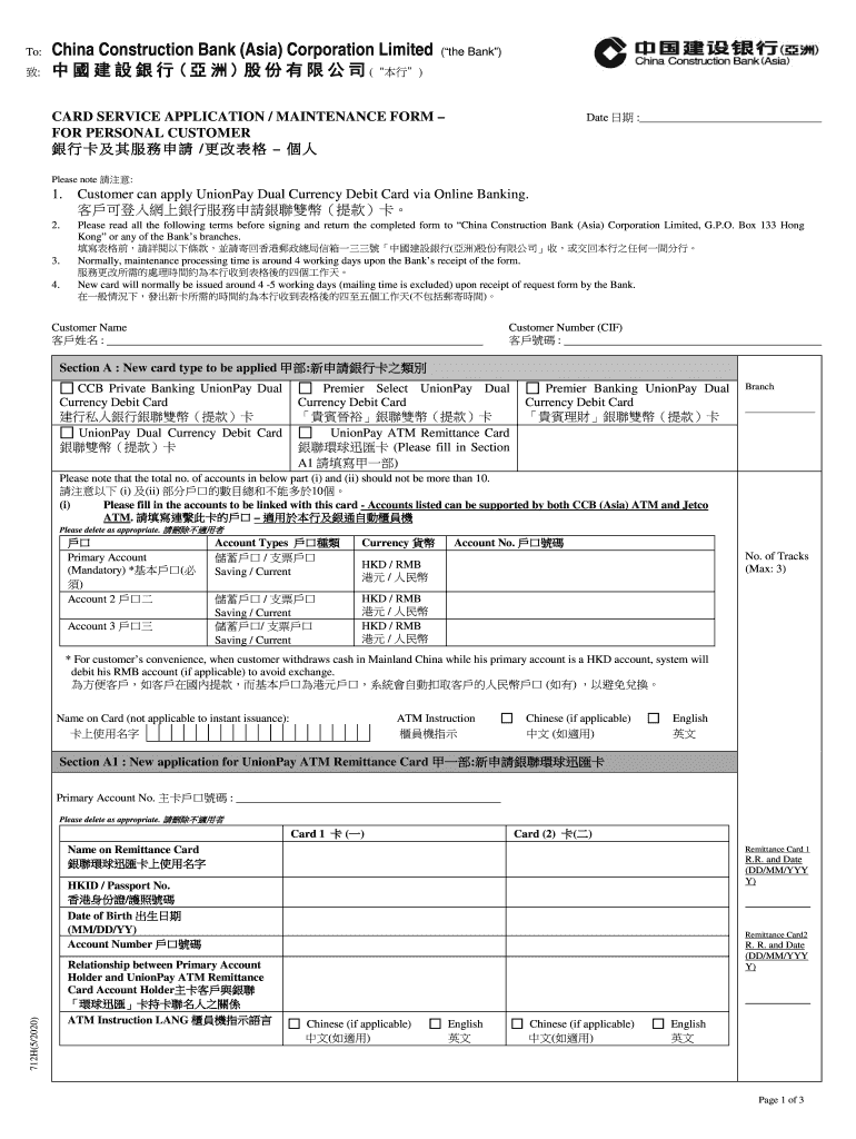 To:China Construction Bank (Asia) Corporation Limited: () ()(the Bank)CARD SERVICE APPLICATION / MAINTENANCE FORM FOR PERSONAL CUSTOMER / Date :Please note :1. Customer can apply UnionPay Dual Currency