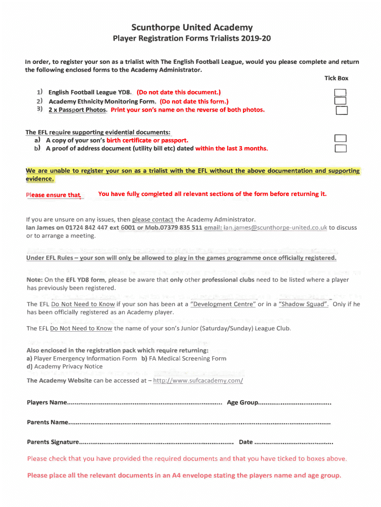 Scunthorpe United AcademyPlayer Registration Forms Realists 201920