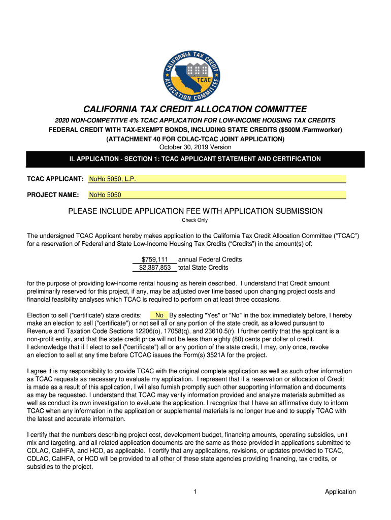 CALIFORNIA TAX CREDIT ALLOCATION COMMITTEE 2020 NONCOMPETITIVE 4% CAC APPLICATION FOR INCOME HOUSING TAX CREDITS FEDERAL CREDIT WITH TAX-EXEMPT BONDS, INCLUDING STATE CREDITS ($500M /Farmworker) (ATTACHMENT