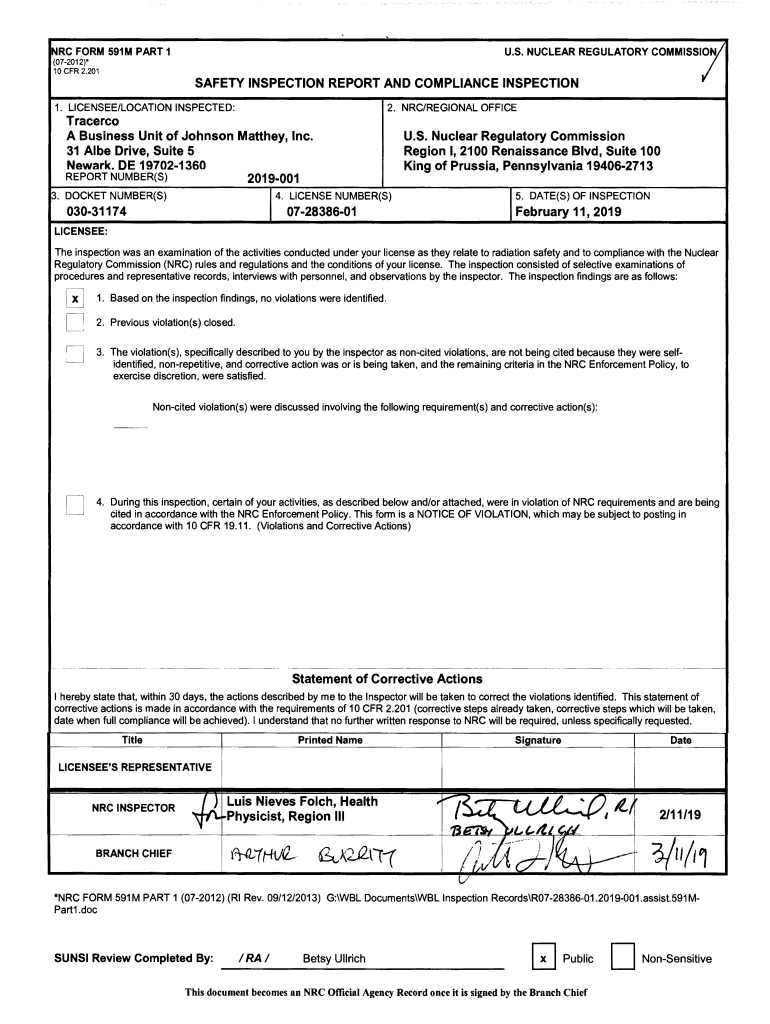 1. LICENSEE/LOCATION INSPECTED:2. NRG/REGIONAL OFFICETracerco