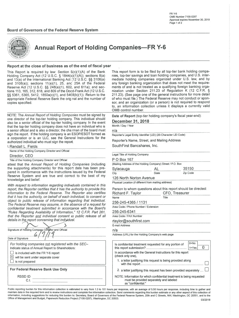 FR Y6 0 MB Number 71000297 Approval expires November 30, 2019-Page 1 of2Board of Governors of the Federal Reserve Systematical Report of Holding Companies FR Y6 Report at the close of business as