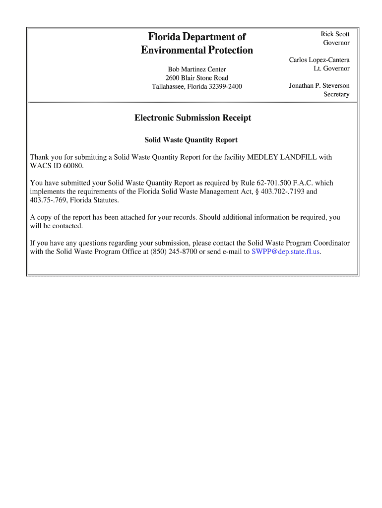 Florida Department of Environmental Protection Bob Martinez Center 2600 Blair Stone Road Tallahassee, Florida 323992400Rick Scott Governor Carlos LopezCantera Lt. Governor Jonathan P. Stevenson SecretaryElectronic