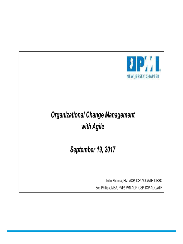 Organizational Change Management with Agile September 19, 2017Nitin Hanna, PMI ACP, ICP ACC/ATF, RSC Bob Phillips, MBA, PMP, PMI ACP, CSP, ICP ACC/Introductions! Yes were cool people! This interactive