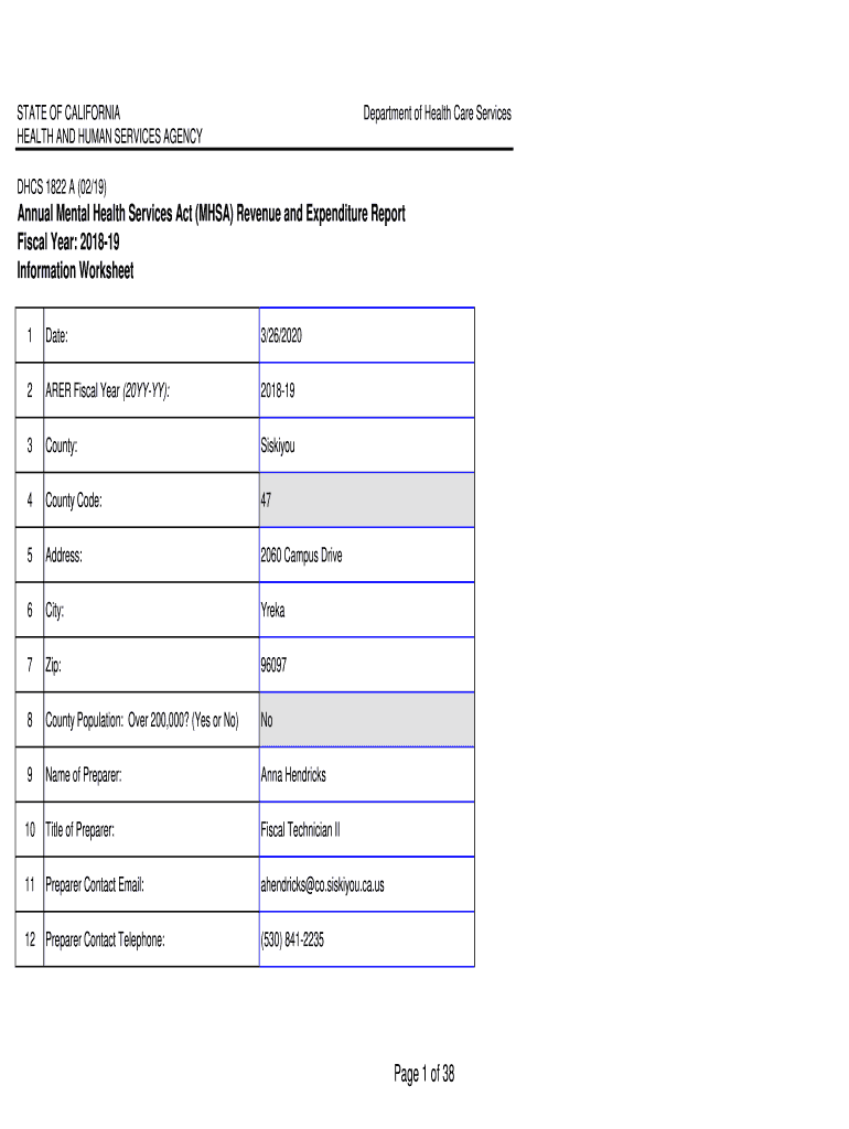HEALTH AND HUMAN SERVICES AGENCYDepartment of Health Care ServicesDHCS 1822 A (02/19)Annual Mental Health Services Act (MESA) Revenue and Expenditure Report