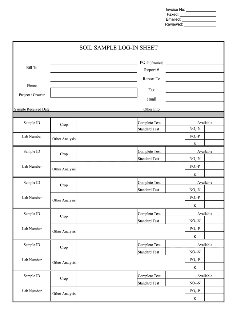 Invoice No: Faxed: Emailed: Reviewed: SOIL SAMPLE LOGIN SHEET PO # (if needed) Bill Tore port # Report ToPhoneFaxProject / GroweremailSample Received Date Sample Other InfoCropComplete Test Standard