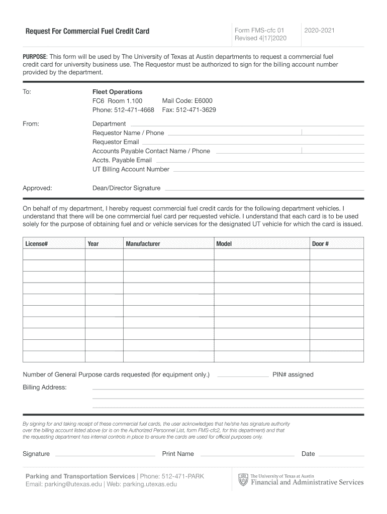 Revised 4|17|2020Request For Commercial Fuel Credit Card20202021PURPOSE: This form will be used by The University of Texas at Austin departments to request a commercial fuel