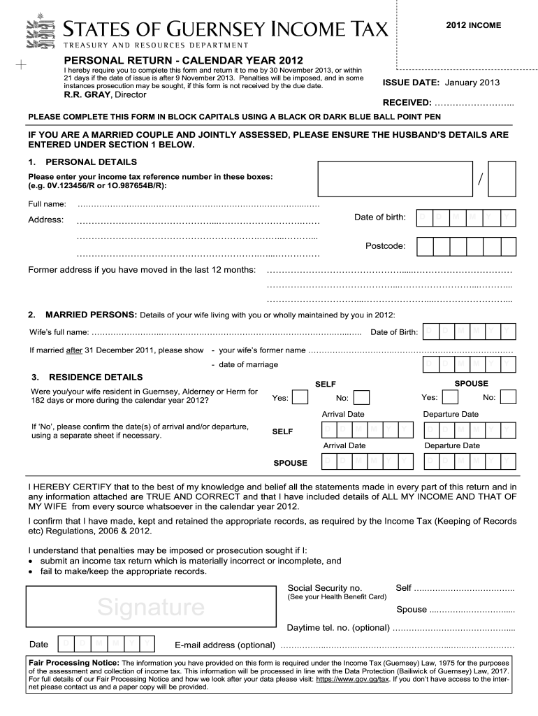 2012 INCOMEPERSONAL RETURN CALENDAR YEAR 2012 I hereby require you to complete this form and return it to me by 30 November 2013, or within 21 days if the date of issue is after 9 November 2013. Penalties