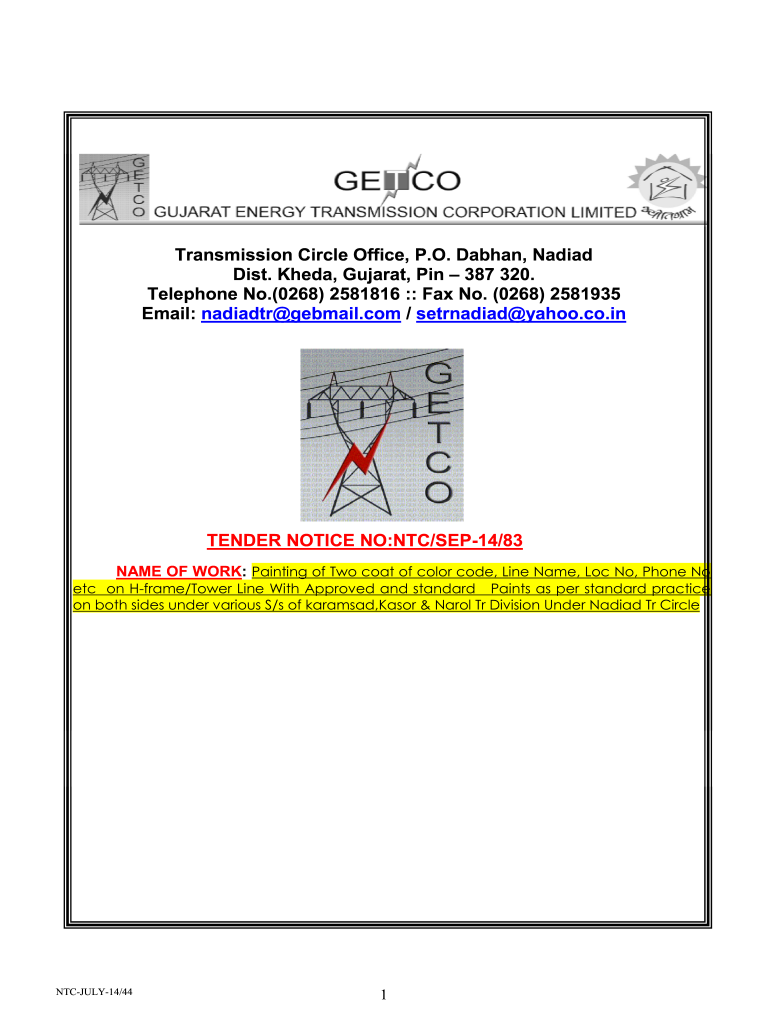 Transmission Circle Office, P.O. Nathan, Nadia Dist. Head, Gujarat, Pin 387 320. Telephone No.(0268) 2581816 :: Fax No. (0268) 2581935 Email: radiant gebmail.com / steradian yahoo.co.intended NOTICE