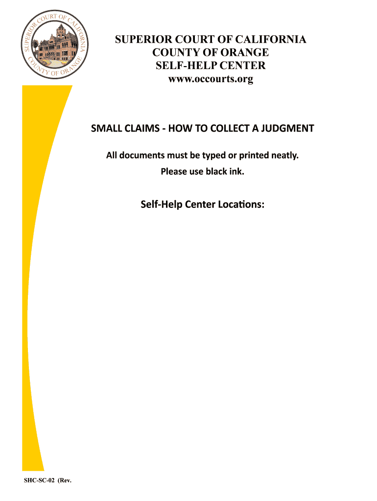 SUPERIOR COURT OF CALIFORNIA COUNTY OF ORANGE SELFLESS CENTER www.occourts.orgSMALL CLAIMS HOW TO COLLECT A JUDGMENT All documents must be typed or printed neatly. Please use black ink. Selfless Center