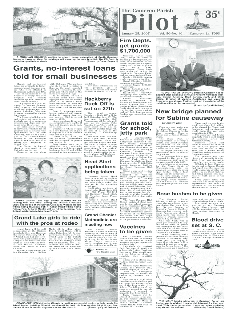 The Cameron Paris Parish Irish is shh Pilot PIL lot out January 25, 2007Vol. Of. 50No. 50No 0 N No 16 15Cameron, La. 70631Fire Depth. Get grants $1,700,000 CameronParishPoliceA MODULAR BUILDING section