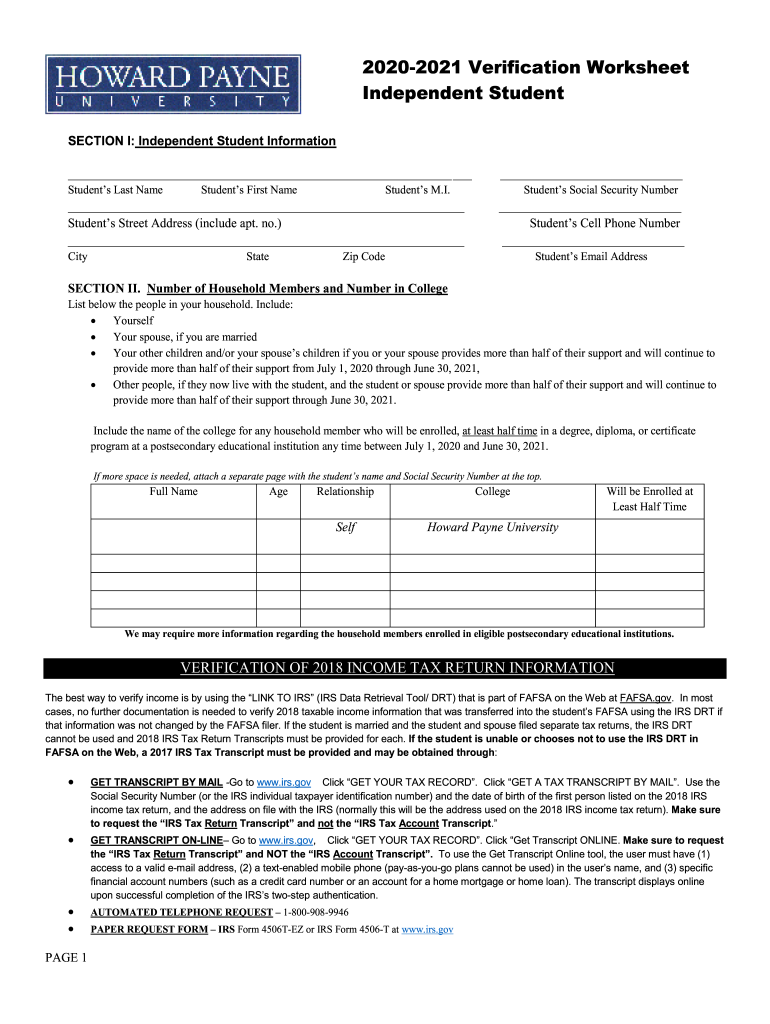 20202021 Verification Worksheet Independent Student Sections I: Independent Student Information Students Street Address (include apt. No.) Students Cell Phone Number Students Last NameStudents First