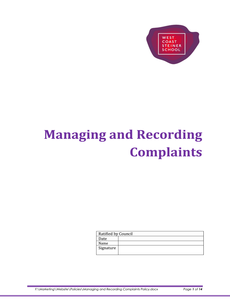Managing and Recording ComplaintsRatified by Council Date NameSignatureF:MarketingWebsitePoliciesManaging and Recording Complaints Policy. Dosage 1 of 14ProvenanceTo be Revised (Date) Related to Standard