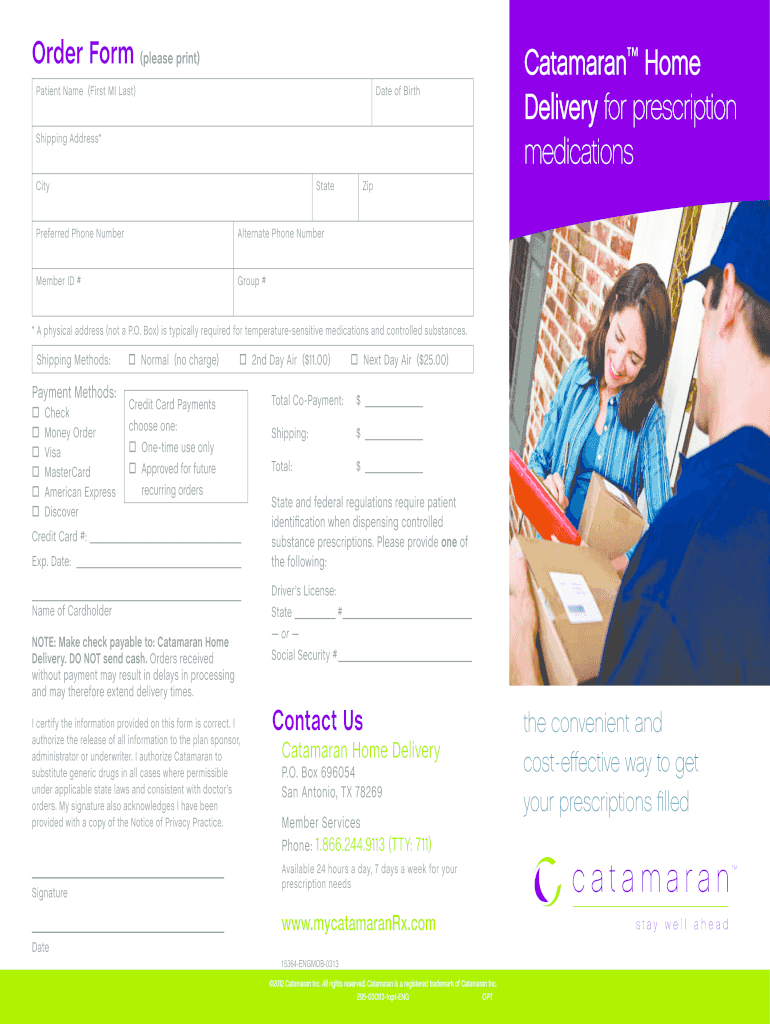 The Catamaran Home Prescription Order Form is a healthcare document used by patients to order prescription medications for home delivery.