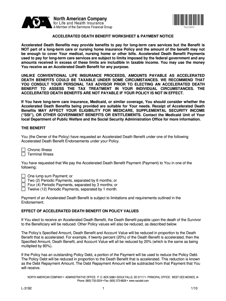 Clear Formulae Kit×L3192×ACCELERATED DEATH BENEFIT WORKSHEET & PAYMENT NOTICE Accelerated Death Benefits may provide benefits to pay for long term care services, but the Benefit is NOT part of a