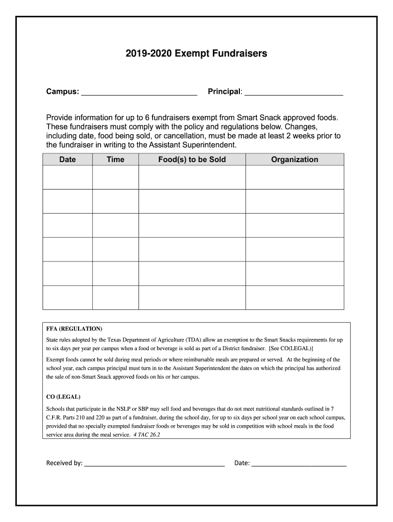 20192020 Exempt FundraisersCampus: Principal: Provide information for up to 6 fundraisers exempt from Smart Snack approved foods. These fundraisers must comply with the policy and regulations below.