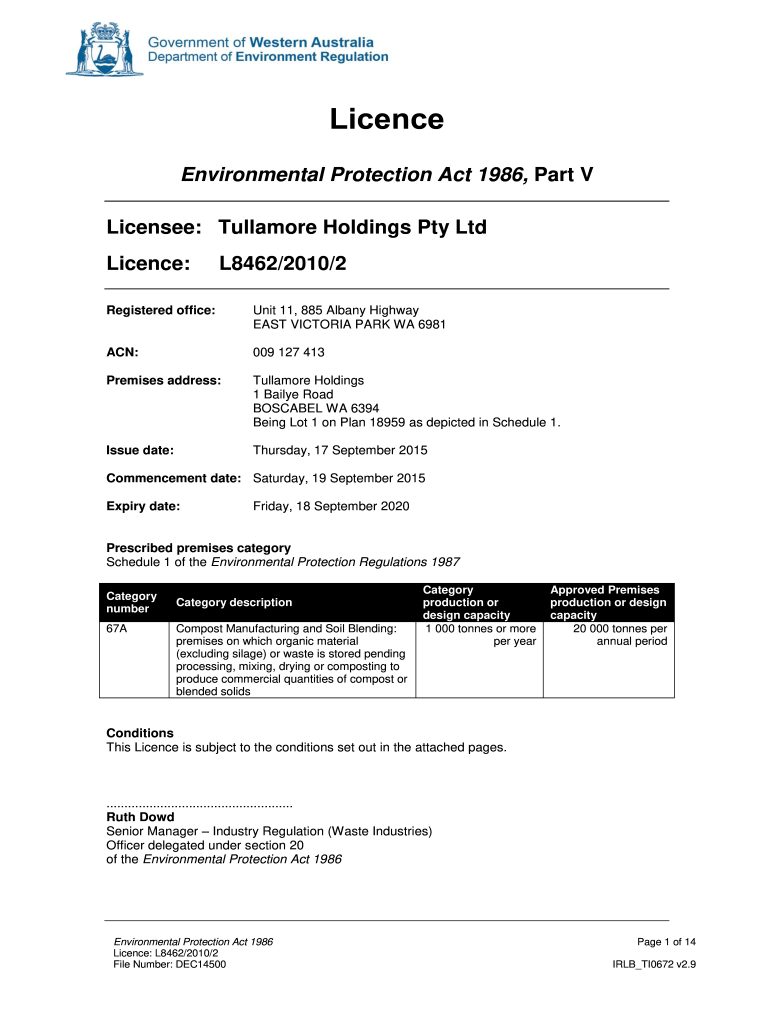 The company or individual holding the license is required to file Licensee Tullamore Holdings Pty.