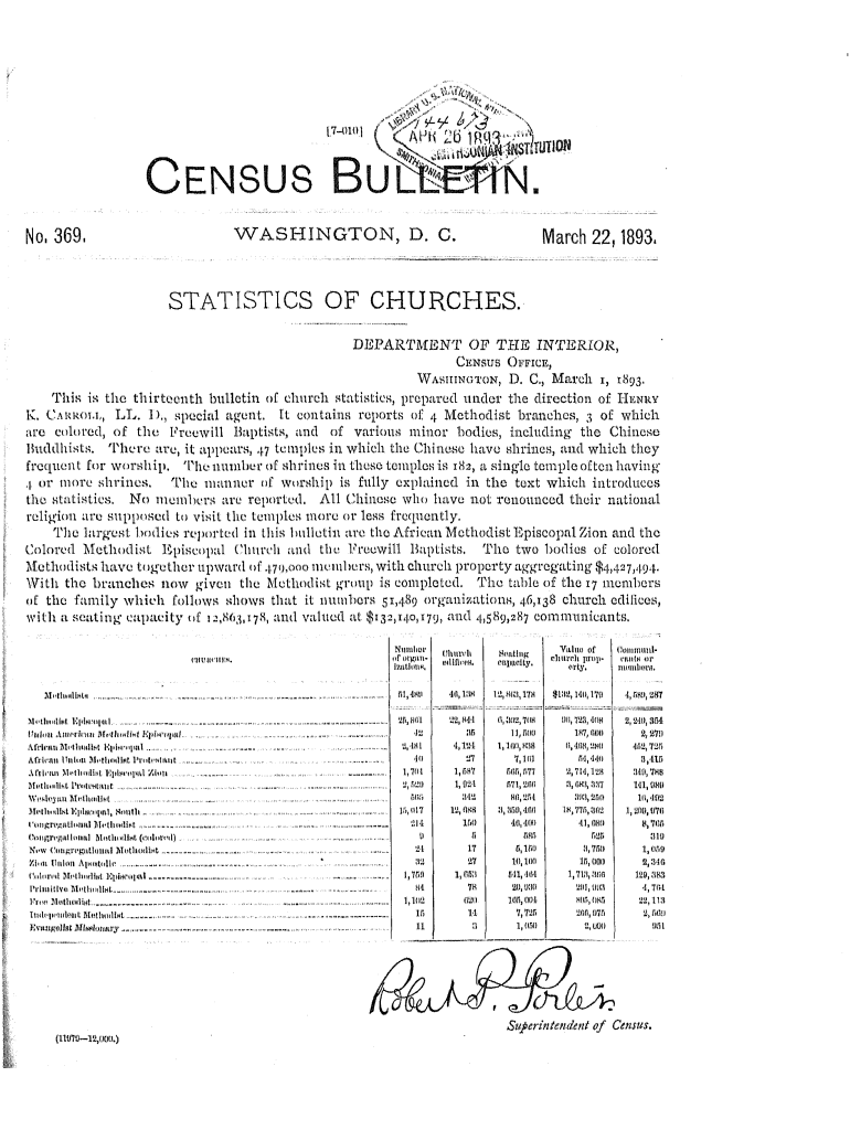 CENSUS WASHINGTON, D. C. No. 369. March 22, 1893.STATISTICS OF CHURCHES. DEPART 'l 'MEN 'I OF 'l 'HE IN '.period., Crates OFFICE, vs Mil!ING1 '0 N, D. c., Ma.RCH I, .t893. 'L 'his is tho thirteenth