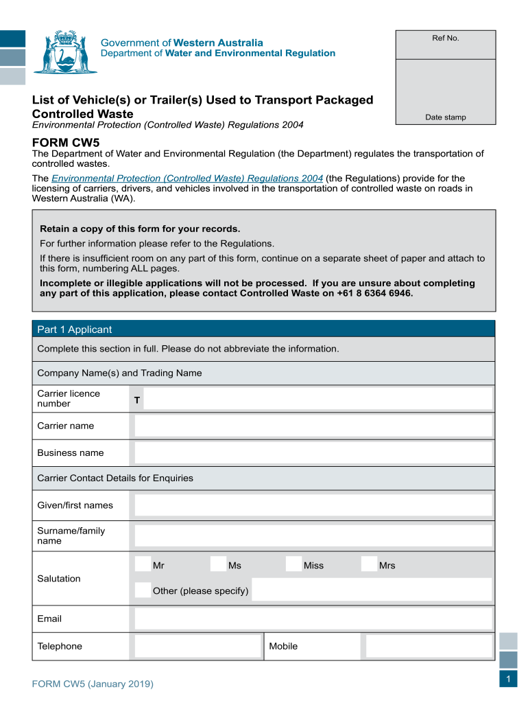 Controlled Waste Date stampEnvironmental Protection (Controlled Waste) Regulations 2004FORM CW5The Department of Water and Environmental