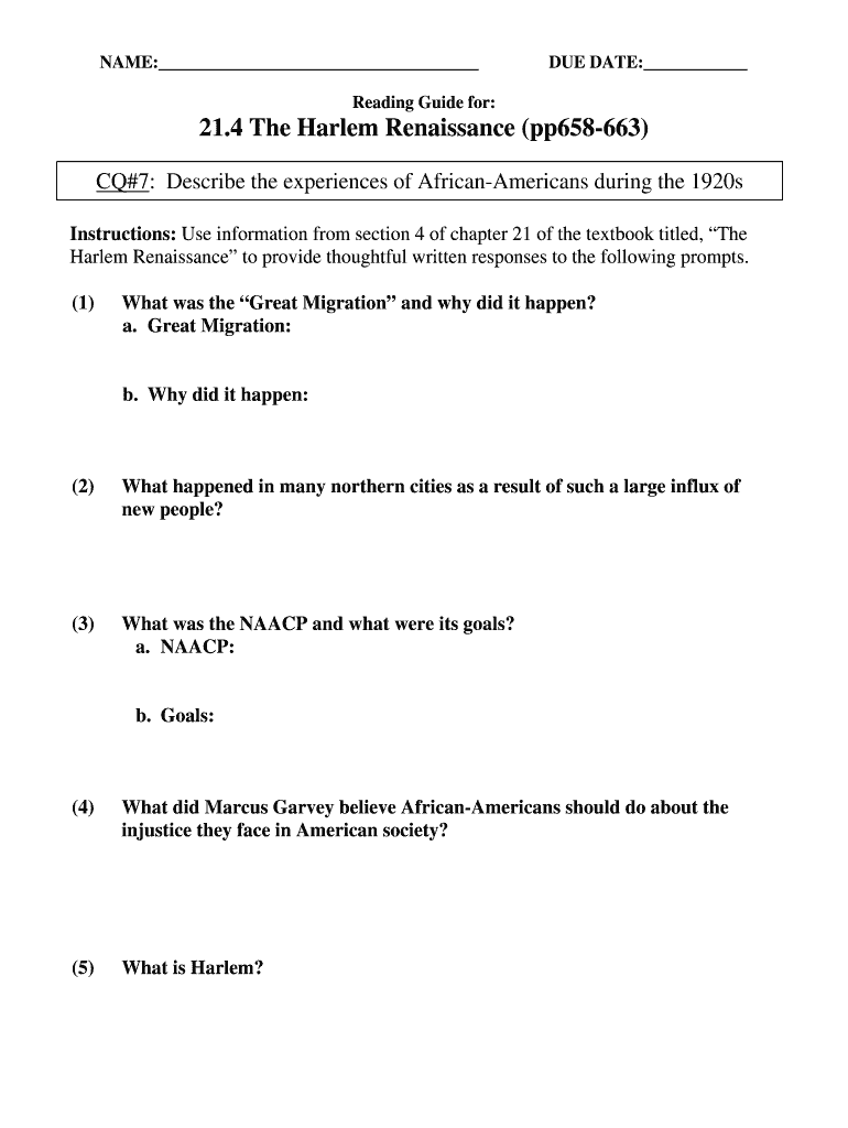 NAME: DUE DATE: Reading Guide for:21.4 The Harlem Renaissance (pp658663) CD#7: Describe the experiences of African Americans during the 1920s Instructions: Use information from section 4 of chapter