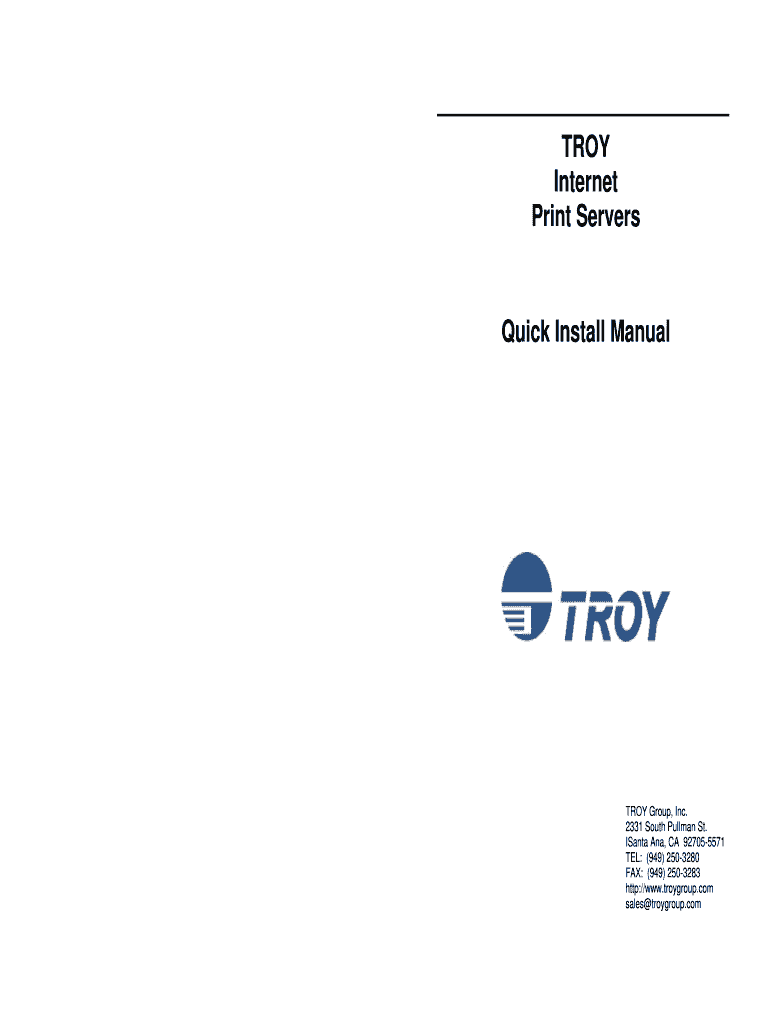 TROY Internet Print ServersQuick Install Manually Group, Inc. 2331 South Pullman St. Santa Ana, CA 927055571 TEL: (949) 2503280 FAX: (949) 2503283 http://www.troygroup.com sales troygroup.com Notice