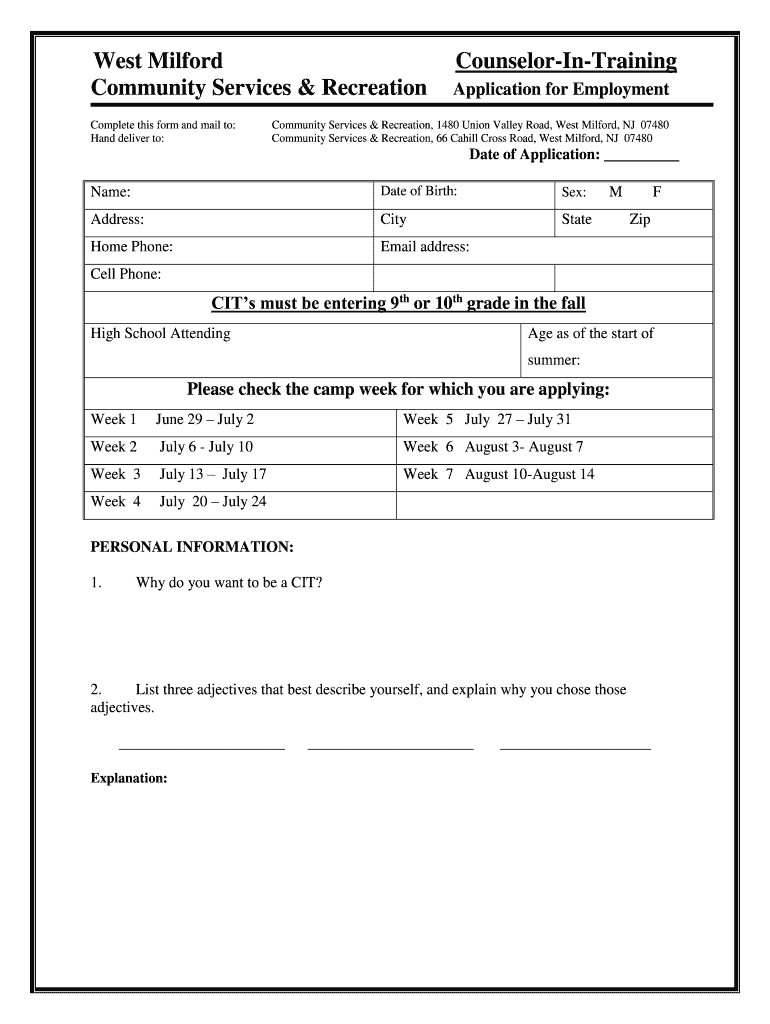 West Milford Community Services & Recreation Complete this form and mail to: Hand deliver to:CounselorInTraining Application for EmploymentCommunity Services & Recreation, 1480 Union Valley Road,