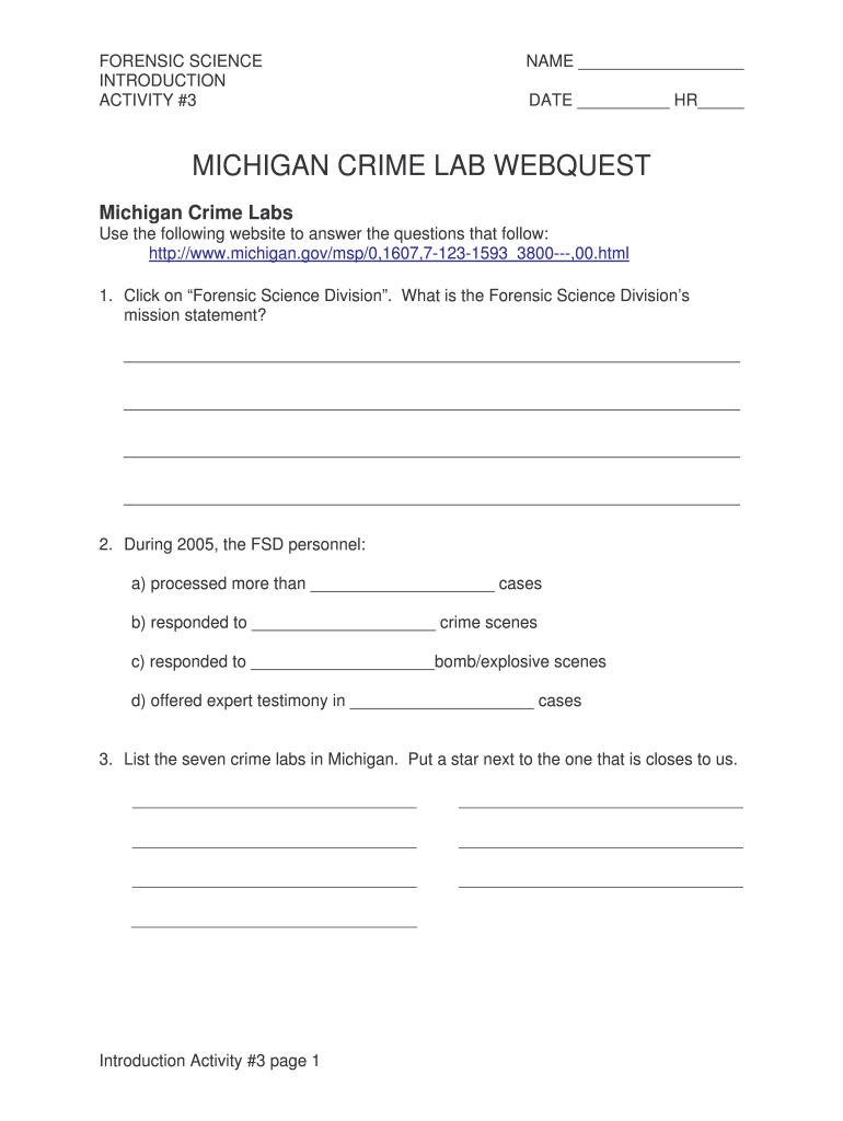 FORENSIC SCIENCE INTRODUCTION ACTIVITY #3NAME DATE HR MICHIGAN CRIME LAB WebQuest Michigan Crime Abuse the following website to answer the questions that follow: http://www.michigan.gov/msp/0,1607,71231593