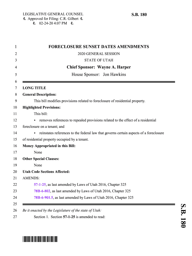 6 022420 4:07 PM 6S. B. 1801FORECLOSURE SUNSET DATES AMENDMENTS22020 GENERAL SESSION3STATE OF UTAH4Chief Sponsor: Wayne A. Harper5House