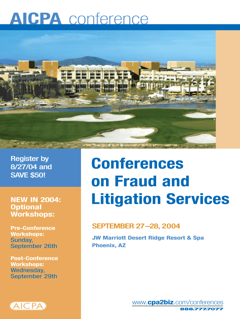 AICPA conferenceRegister by 8/27/04 and SAVE $50!NEW IN 2004: Optional Workshops: Conference Workshops:Sunday, September 26thConferences on Fraud and Litigation Services SEPTEMBER 2728, 2004 JR Marriott