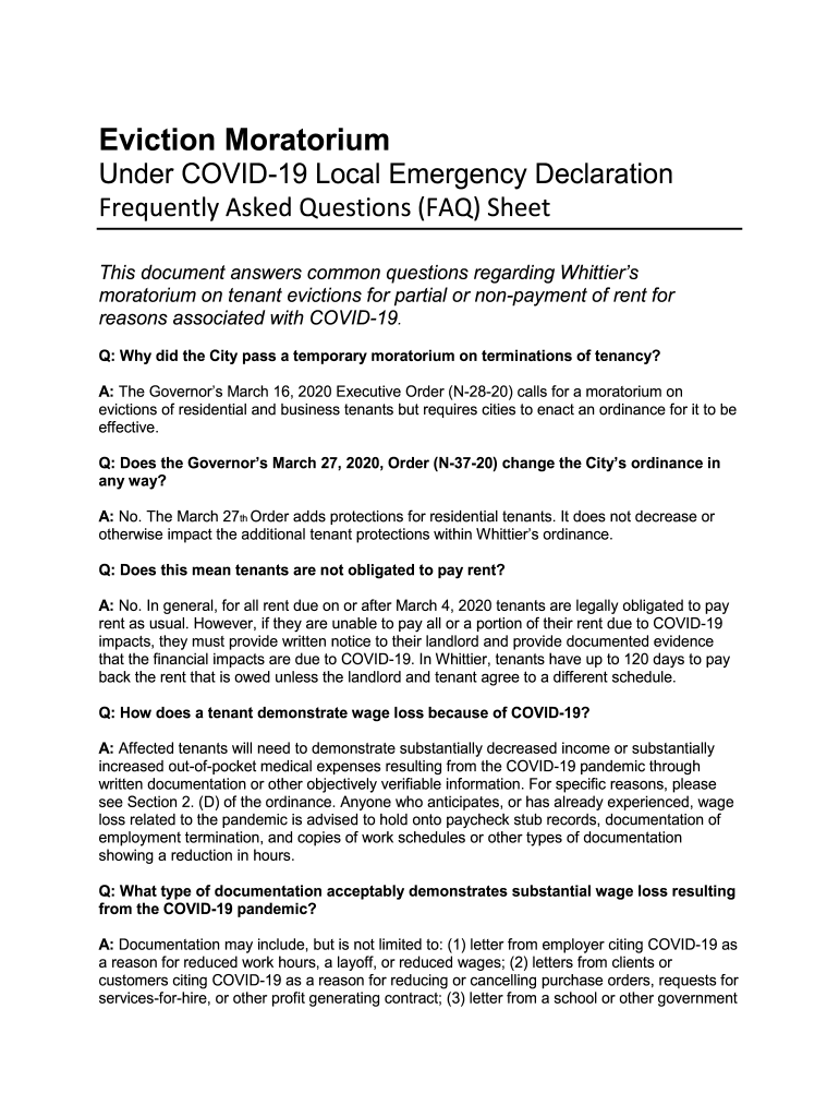 Eviction MoratoriumUnder COVID-19 Local Emergency Declaration