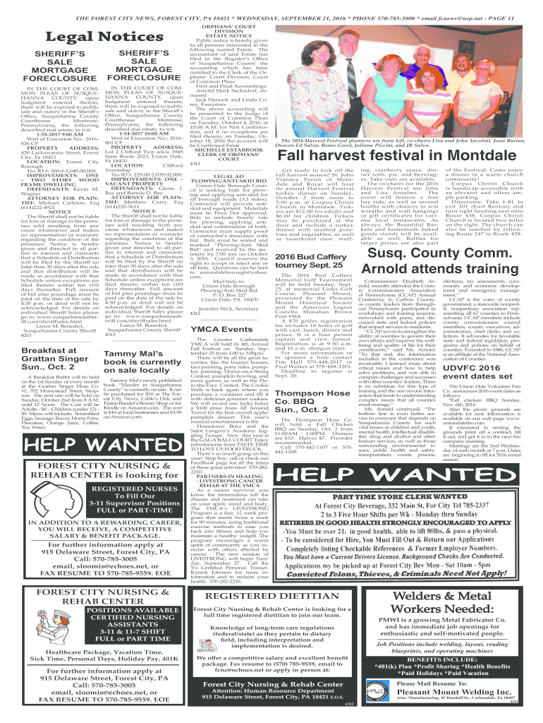 THE FOREST CITY NEWS, FOREST CITY, PA 18421 * WEDNESDAY, SEPTEMBER 21, 2016 * PHONE 5707853800 * email news NEP.net PAGE 11Legal Notices SHERIFFS SALE MORTGAGE FORECLOSURESHERIFFS SALE MORTGAGE FORECLOSURE