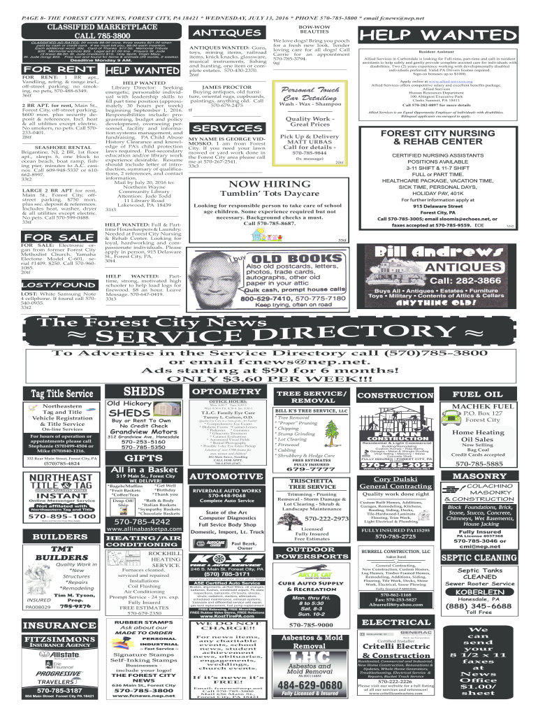 PAGE 8 THE FOREST CITY NEWS, FOREST CITY, PA 18421 * WEDNESDAY, JULY 13, 2016 * PHONE 5707853800 * email fcnews@nep.netCLASSIFIED MARKETPLACE