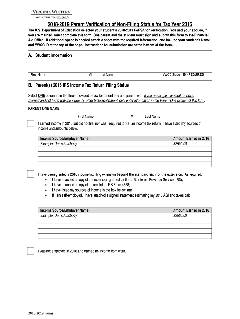 Get the free 2018-2019 Parent Verification of Non-Filing Status for Tax ...
