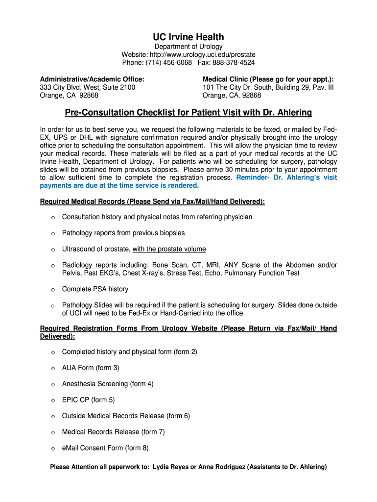 The Pre-Consultation Checklist specific to urology patient visits at UC Irvine Health is a vital document designed to streamline the registration process. This checklist serves to gather essential medical history and registration forms needed before a consultation with Dr. Ahlering. By providing the necessary information upfront, patients can help ensure a more efficient appointment and better communication during their visit.
