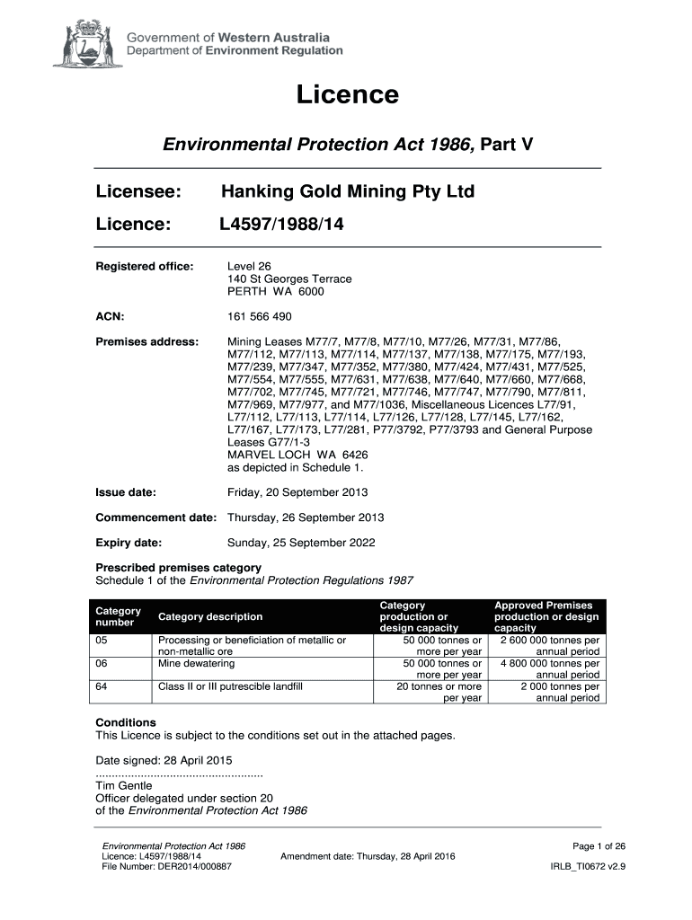 Licensee:Banking Gold Mining Pty LtdLicence:L4597/1988/14Registered office:Level 26