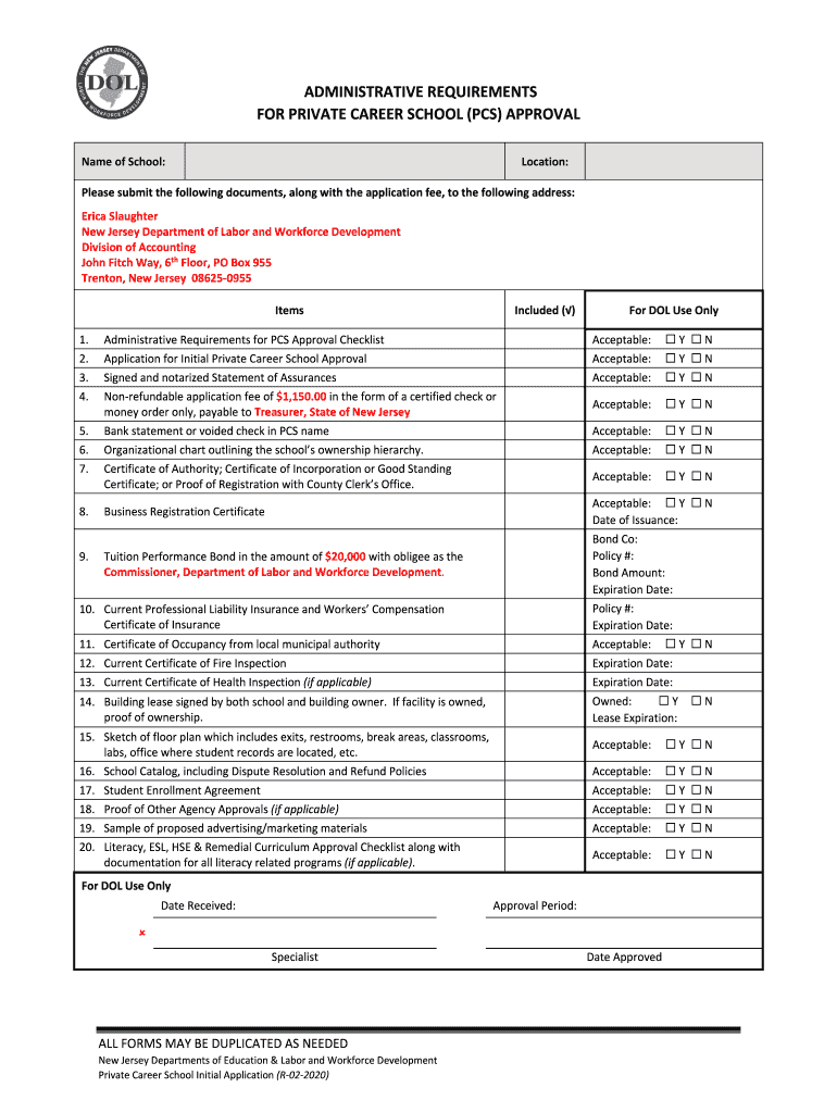 PRIVATECAREERSCHOOL(PCS) INITIALAPPLICATION NewJerseyAdministrativeCodeTitle12,Chapter41 NewJerseyAdministrativeCodeTitle6A,Chapter19 StateofNewJersey DepartmentofEducation DepartmentofLaborandWorkforceDevelopment