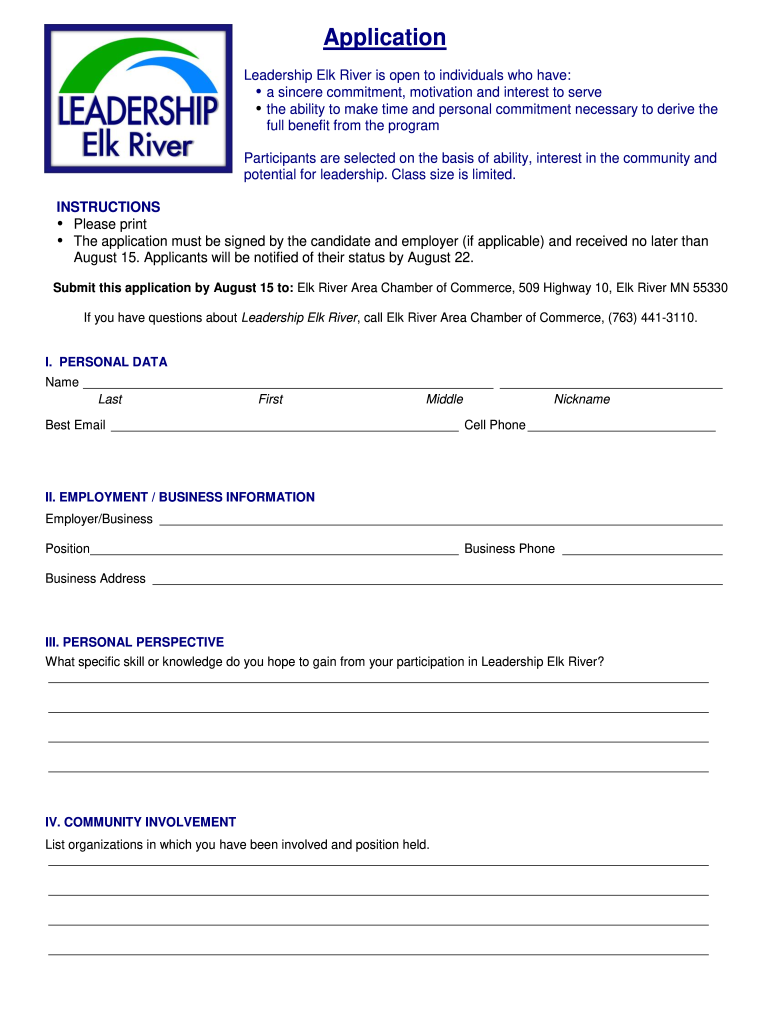 Application Leadership Elk River is open to individuals who have: a sincere commitment, motivation and interest to serve the ability to make time and personal commitment necessary to derive the full
