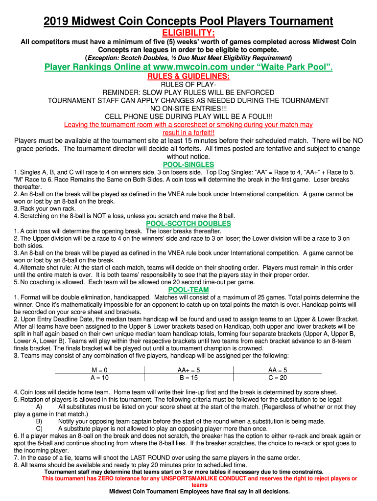 2019 Midwest Coin Concepts Pool Players Tournament ELIGIBILITY: All competitors must have a minimum of five (5) weeks worth of games completed across Midwest Coin Concepts ran leagues in order to