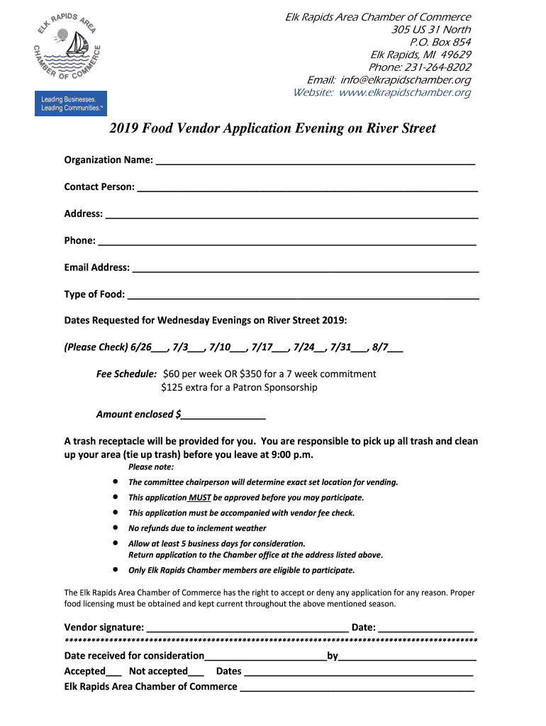 Elk Rapids Area Chamber of Commerce 305 US 31 North P.O. Box 854 Elk Rapids, MI 49629 Phone: 2312648202 Email: info elkrapidschamber.org Website: www.elkrapidschamber.org2019 Food Vendor Application