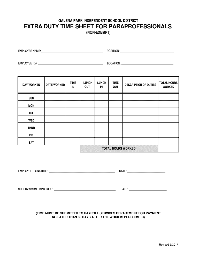 GALENA PARK INDEPENDENT SCHOOL DISTRICTEXTRA DUTY TIME SHEET FOR PARAPROFESSIONALS (NONEXEMPT)EMPLOYEE NAME: POSITION: EMPLOYEE ID#: LOCATION: DAY WORKMATE WORKED TIME LUNCH IN TIME DESCRIPTION OF