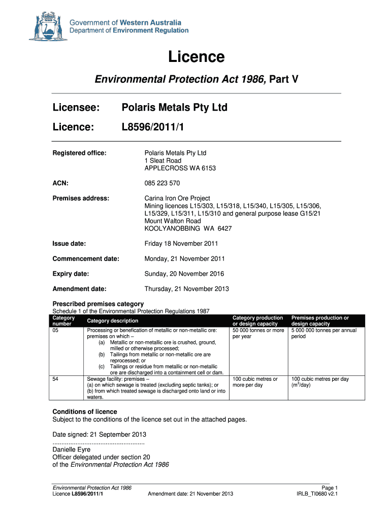 Licensee:Polaris Metals Pty LtdLicence:L8596/2011/1Registered office:Polaris Metals Pty Ltd