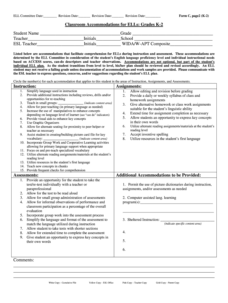 ELL Committee Date: Revision Date: Revision Date: Revision Date: Form C, page2 (K2)Classroom Accommodations for Ells: Grades K2 Student Name Grade Teacher Initials School ESL Teacher Initials WIDE/WAIT