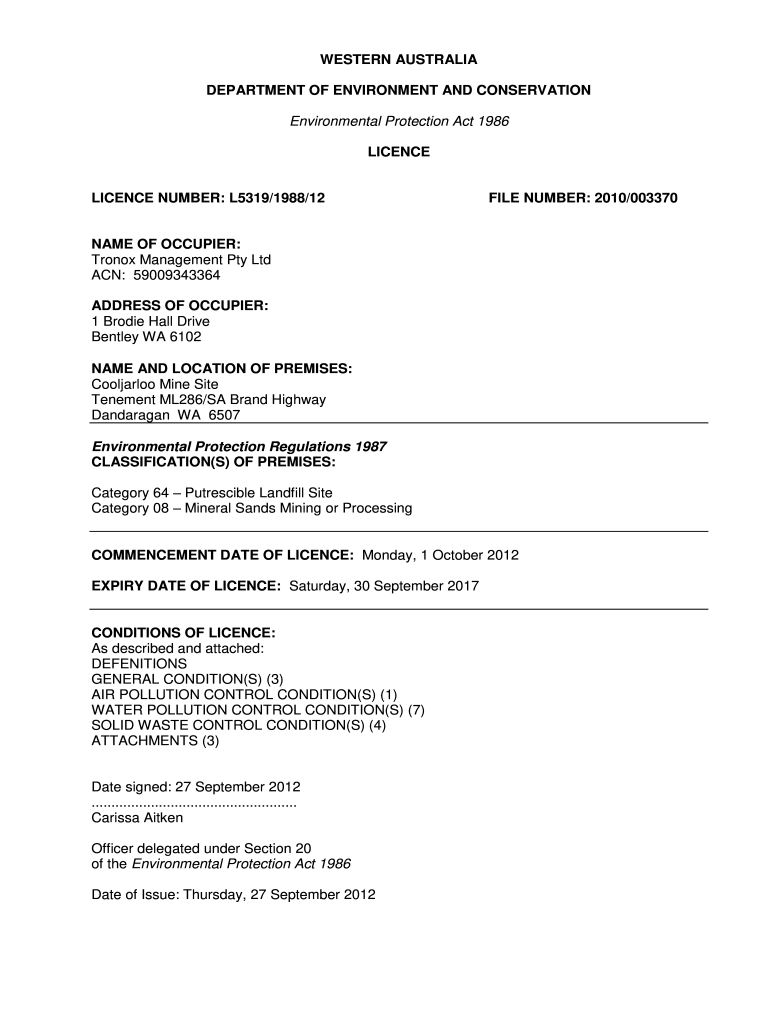 WESTERN AUSTRALIA DEPARTMENT OF ENVIRONMENT AND CONSERVATION Environmental Protection Act 1986 LICENCELICENCE NUMBER: L5319/1988/12FILE NUMBER: 2010/003370NAME OF OCCUPIER: Tron ox Management Pty