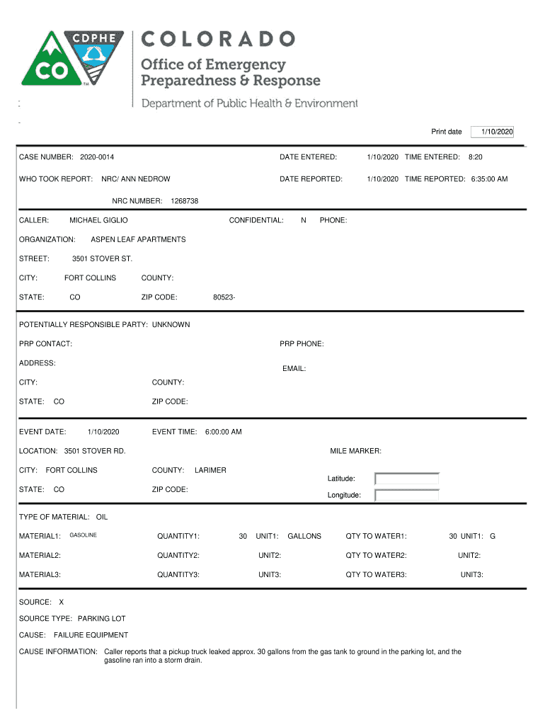COLORADO Office of Emergency Preparedness & Response Department of Public Health & Environment Print date1/10/2020CASE NUMBER: 20200014DATE ENTERED:1/10/2020 TIME ENTERED:WHO TOOK REPORT:DATE REPORTED:1/10/2020