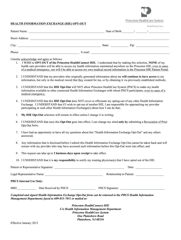 HEALTH INFORMATION EXCHANGE (HIE) OPT-OUT Patient Name: Date of Birth / / Street Address: City: State: Zip: Phone: Email: I hereby acknowledge and agree as follows: 1. I WISH to OPT-OUT of the Princeton