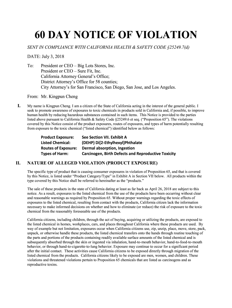 60 DAY NOTICE OF VIOLATION SENT IN COMPLIANCE WITH CALIFORNIA HEALTH & SAFETY CODE 25249.7(d) DATE: July 3, 2018, To:President or CEO Big Lots Stores, Inc. President or CEO Sure Fit, Inc. California