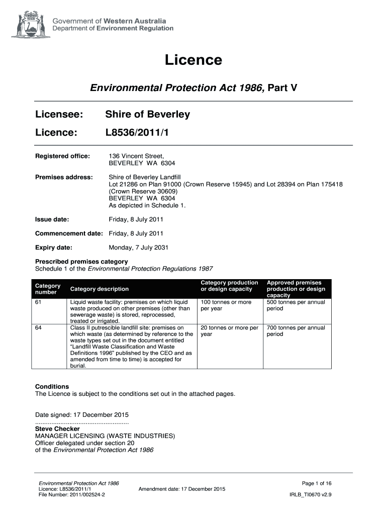 Licensee:Shire of BeverleyLicence:L8536/2011/1Registered office:136 Vincent Street,