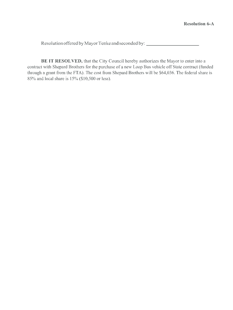 Resolution 6AResolution offered by Mayor Tense and seconded by: BE IT RESOLVED, that the City Council hereby authorizes the Mayor to enter into a contract with Shepard Brothers for the purchase of