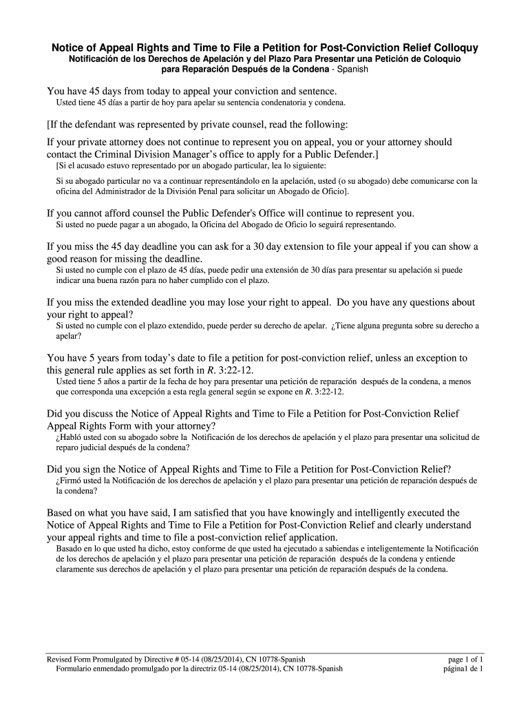 Notice of Appeal Rights and Time to File a Petition for PostConviction Relief Colloquy Notification de Los Searches de Apelacin y Del Plaza Para Presenter RNA Petition de Coloquio para Reparation